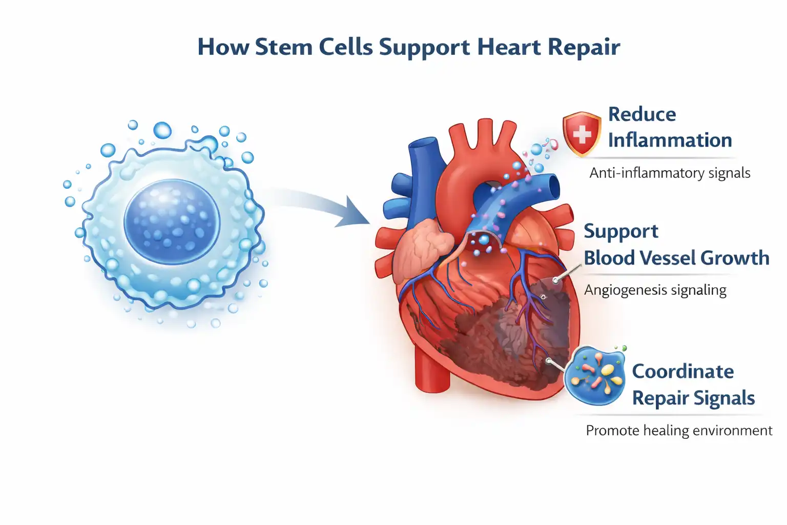 How stem cells may help: Stem cells release factors like VEGF (vascular endothelial growth factor) that may support the growth of new blood vessels-a process called angiogenesis. Better blood supply means better oxygen and nutrient delivery to healing tissue, potentially improving heart function over time.